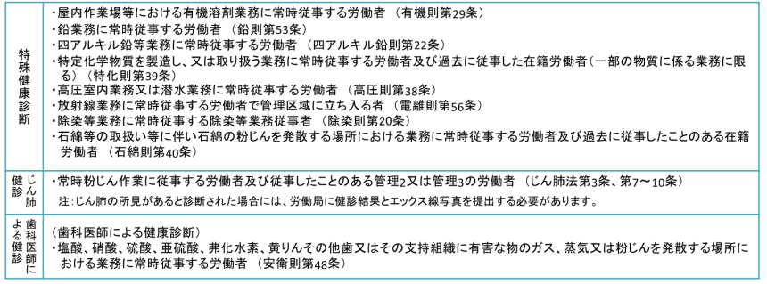 また、次の有害な業務に常時従事する労働者等に対し、原則として、雇入れ時、配置替えの際及び6月以内ごとに1回(じん肺健診は管理区分に応じて1~3年以内ごとに1回)、それぞれ特別の健康診断を実施しなければなりません。